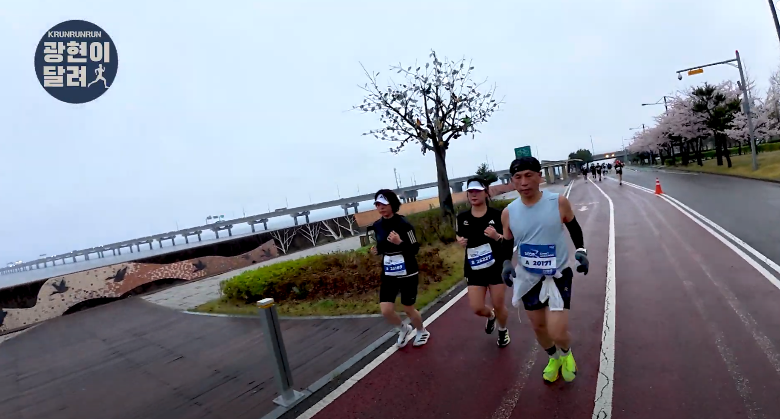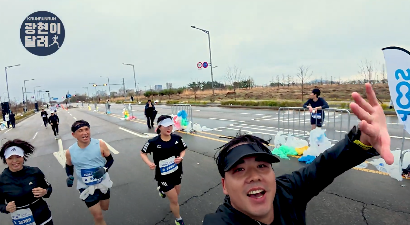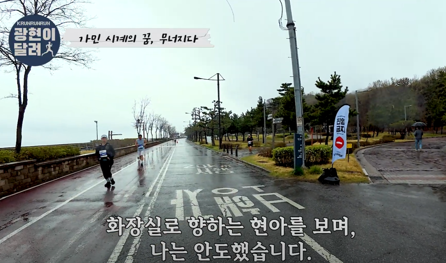 며칠 전, 워크브레이크 영상에서 "10km를 1시간 안에 들어오면 가민 시계를 선물하겠다"고 했었는데 이상한 형이 술자리에서 갑자기 말을 바꿨다. "야~ 하프 2시간 20분도 사줘~~!" 사람들 앞에서 그렇게 말해버리니까, 나도 어쩔 수 없이 OK 해버렸다. 술이 문제였다, 진짜. 그 얘기를 다시 현아에게 상기시켰다. 목표를 주면 조금 더 버티고 버티겠지 싶어서. 출발선에 섰다. 몸은 무겁고 마음은 불안했지만, 그래도 출발했다. 비바람을 뚫고, 그렇게 우리의 레이스가 시작됐다.